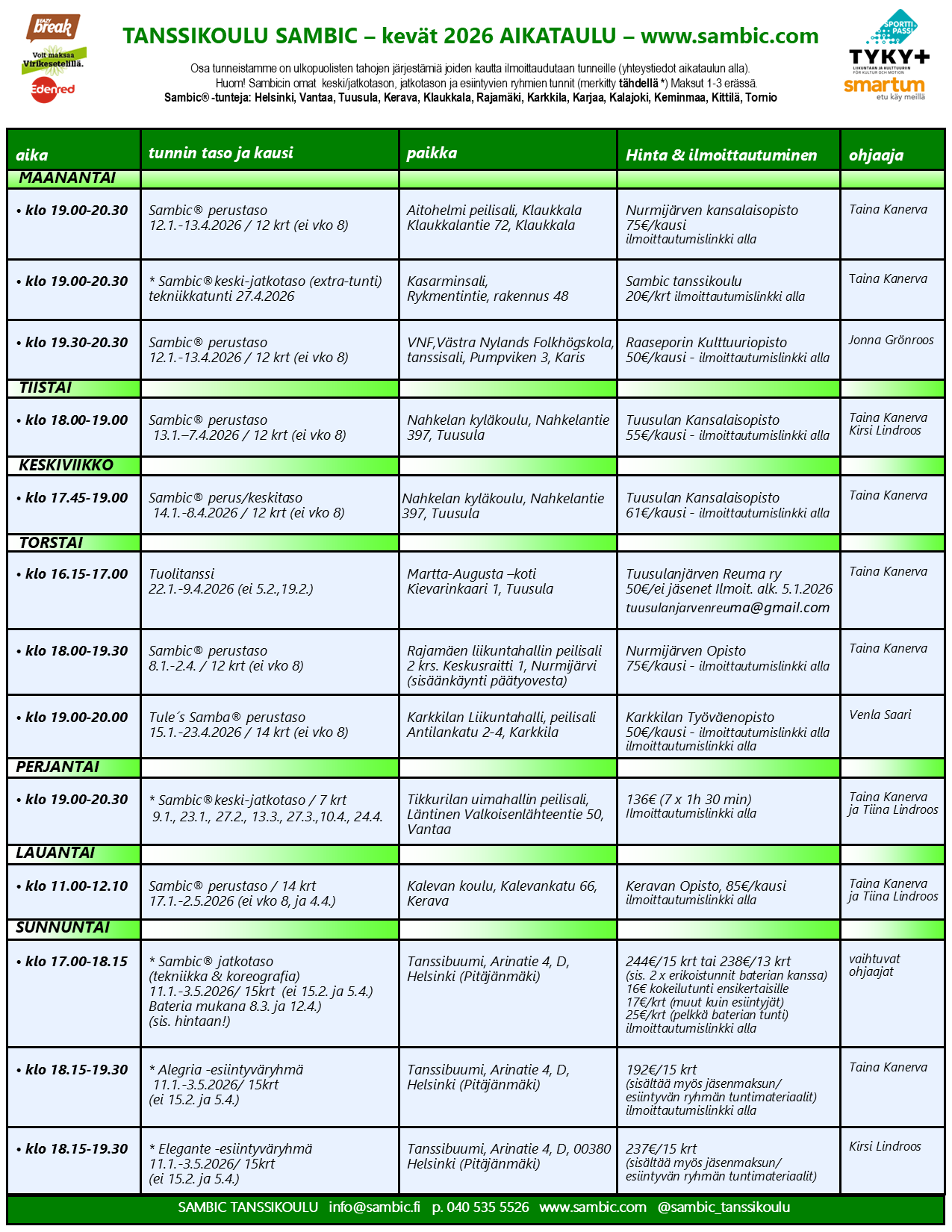 Voit suurentaa alla olevaa aikataulua selaimessasi. Aikatauluun on koottu ns. omia tuntejamme joihin ilmoittaudutaan Sambic tanssikoulun kautta sekä muiden ulkopuolisten tahojen tilaamia Sambic-tunteja. Ulkopuoliset tilaajat (mm. opistot/seurat/yhdistykset) vastaavat omien ryhmiensä tuntimaksuista ja ilmoittautumisista.
